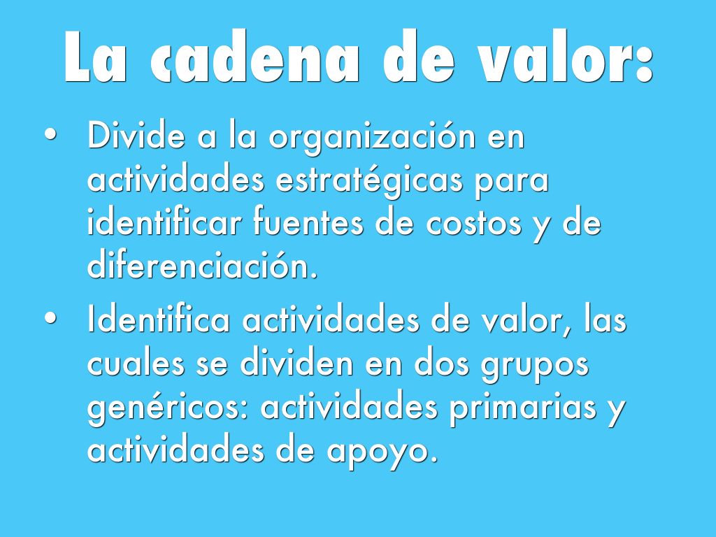 • Divide a la organización en actividades estratégicas para identificar fuentes de costos y de diferenciación.
