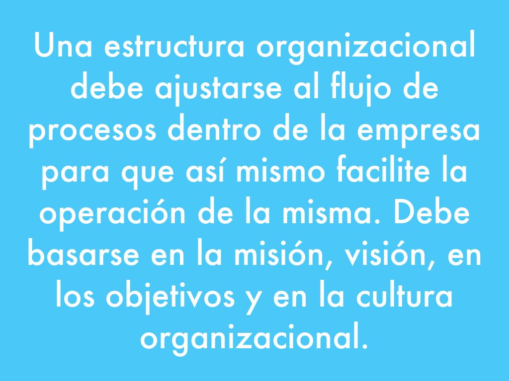 Una estructura organizacional debe ajustarse al flujo de procesos dentro de la empresa para que así mismo facilite la operación de la misma. Debe basarse en la misión, visión, en los objetivos y en la cultura organizacional.