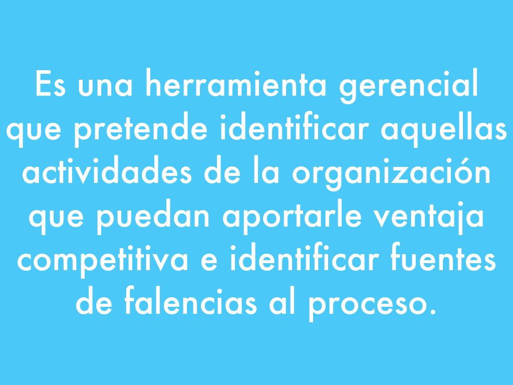Es una herramienta gerencial que pretende identificar aquellas actividades de la organización que puedan aportarle ventaja competitiva e identificar fuentes de falencias al proceso.