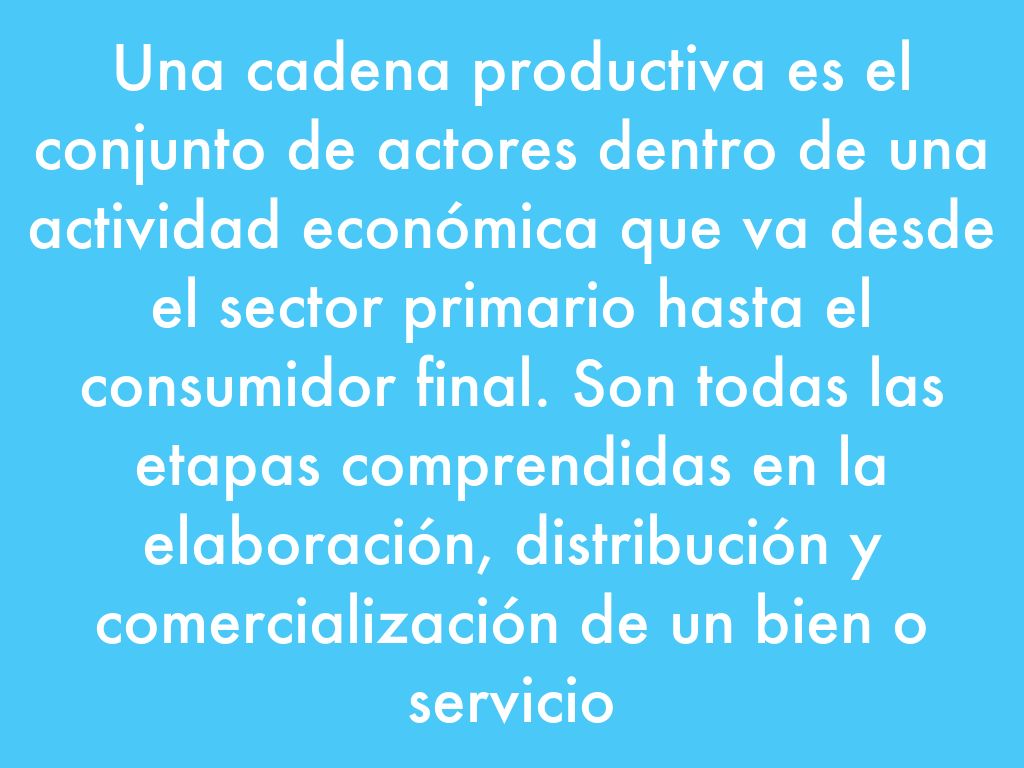 Una cadena productiva es el conjunto de actores dentro de una actividad económica que va desde el sector primario hasta el consumidor final. Son todas las etapas comprendidas en la elaboración, distribución y comercialización de un bien o servicio.