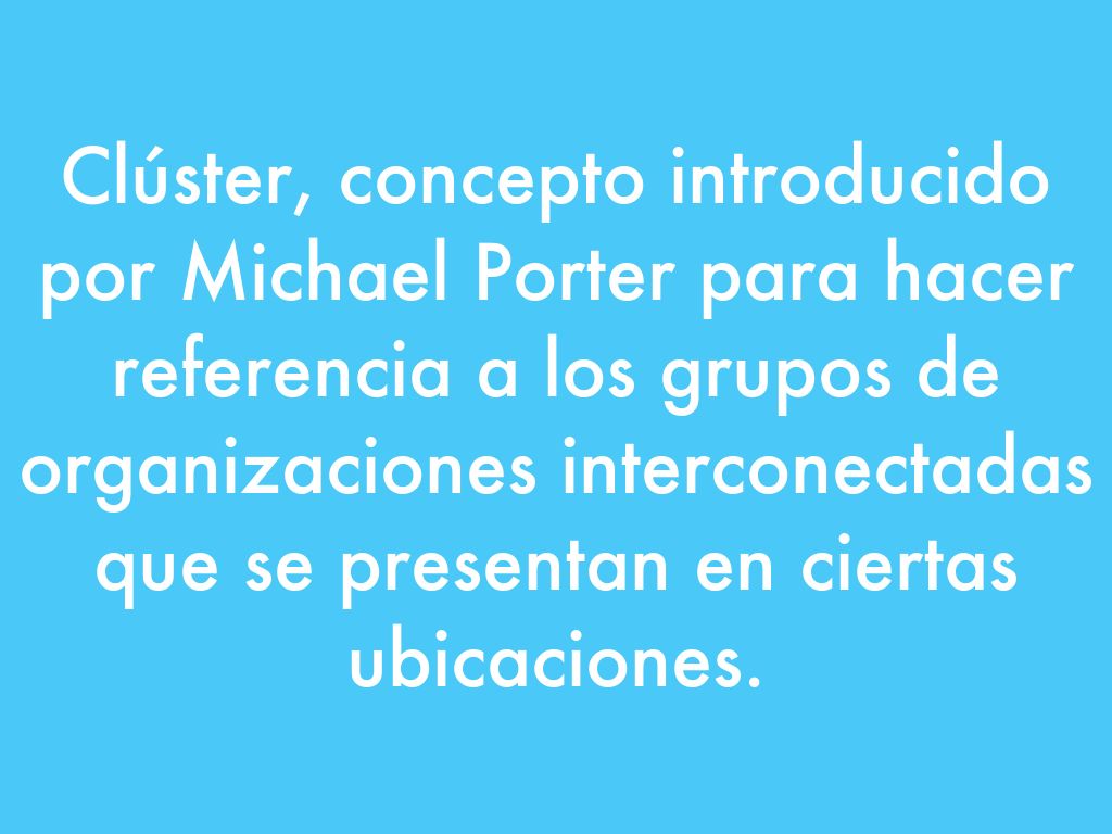 Clúster, concepto introducido por Michael Porter para hacer referencia a los grupos de organizaciones interconectadas que se presentan en ciertas ubicaciones.