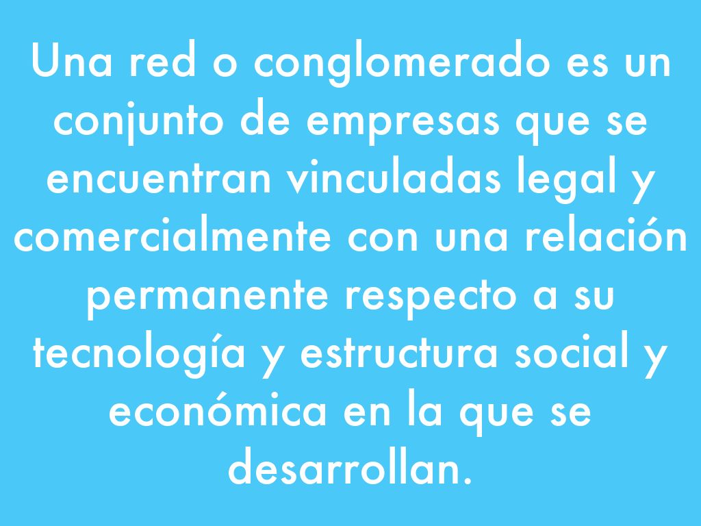 Una red o conglomerado es un conjunto de empresas que se encuentran vinculadas legal y comercialmente con una relación permanente respecto a su tecnología y estructura social y económica en la que se desarrollan.