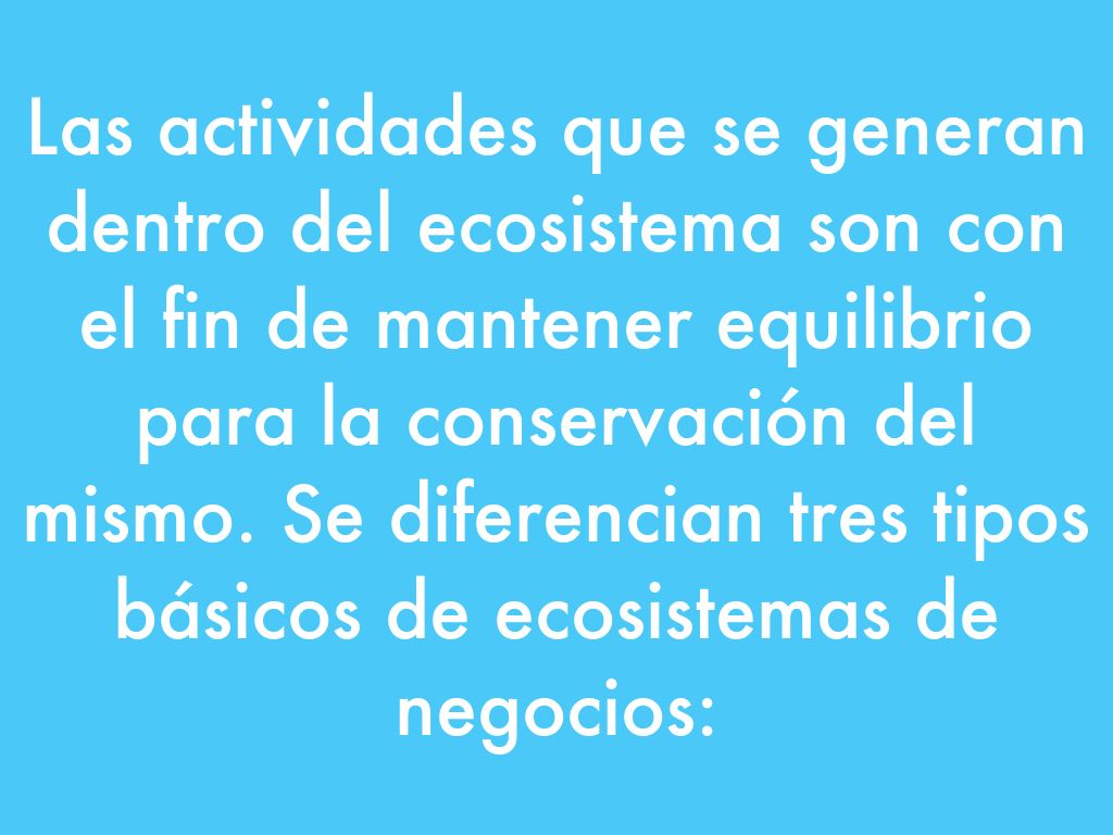 Las actividades que se generan dentro del ecosistema son con el fin de mantener equilibrio para la conservación del mismo. Se diferencian tres tipos básicos de ecosistemas de negocios: