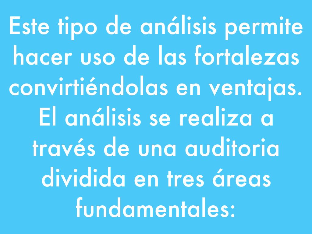 Este tipo de análisis permite hacer uso de las fortalezas convirtiéndolas en ventajas. El análisis se realiza a través de una auditoria dividida en tres áreas fundamentales: