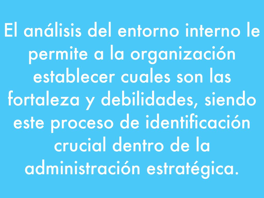 El análisis del entorno interno le permite a la organización establecer cuales son las fortaleza y debilidades, siendo este proceso de identificación crucial dentro de la administración estratégica.