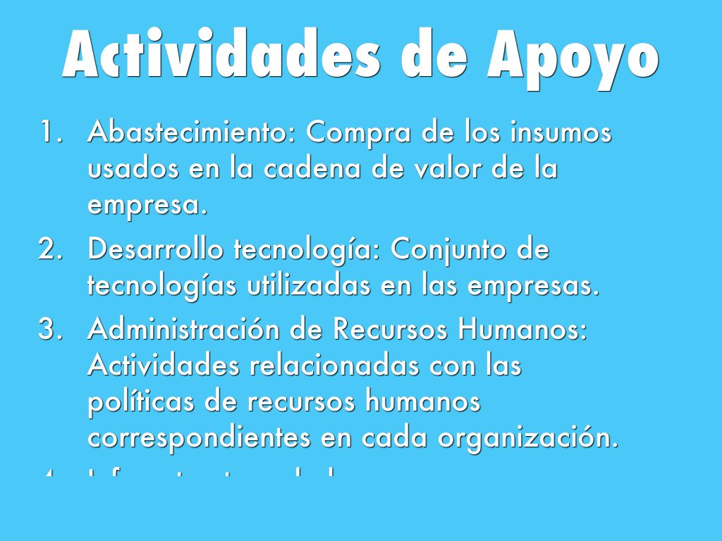 • Abastecimiento: Compra de los insumos usados en la cadena de valor de la empresa.