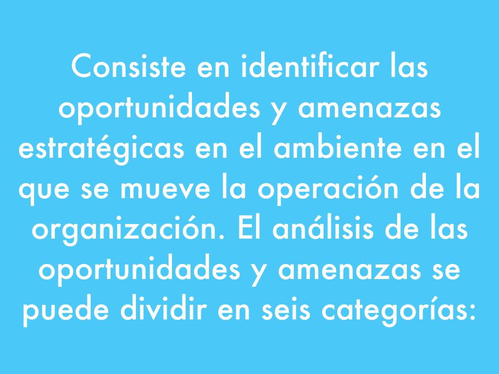 Consiste en identificar las oportunidades y amenazas estratégicas en el ambiente en el que se mueve la operación de la organización. El análisis de las oportunidades y amenazas se puede dividir en seis categorías: