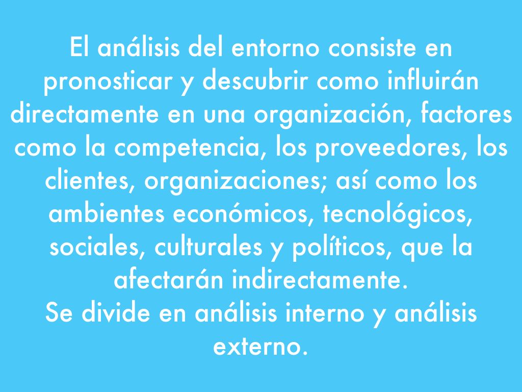 El análisis del entorno consiste en pronosticar y descubrir como influirán directamente en una organización, factores como la competencia, los proveedores, los clientes, organizaciones; así como los ambientes económicos, tecnológicos, sociales, culturales y políticos, que la afectarán indirectamente.