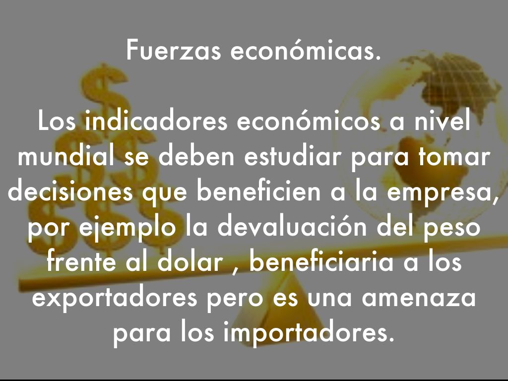 Los indicadores económicos a nivel mundial se deben estudiar para tomar decisiones que beneficien a la empresa, por ejemplo la devaluación del peso frente al dolar , beneficiaria a los exportadores pero es una amenaza para los importadores.