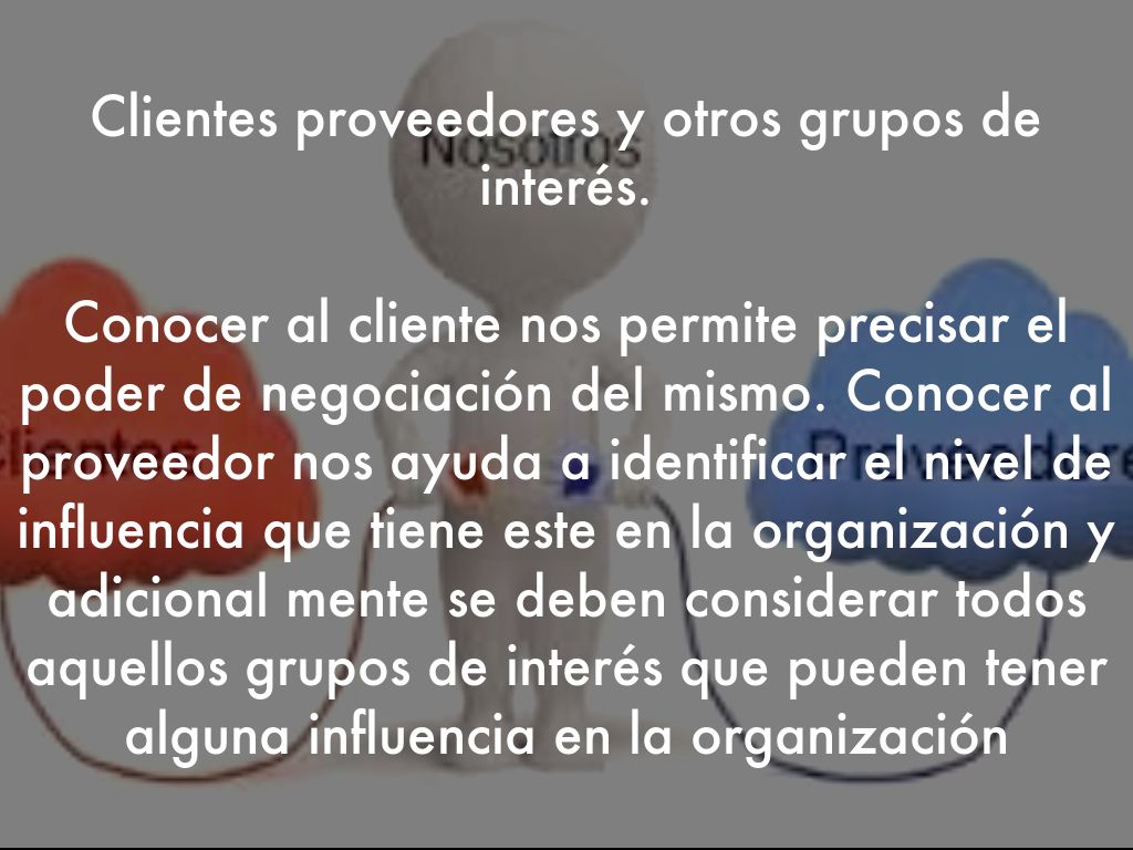Conocer al cliente nos permite precisar el poder de negociación del mismo. Conocer al proveedor nos ayuda a identificar el nivel de influencia que tiene este en la organización y adicional mente se deben considerar todos aquellos grupos de interés que pueden tener alguna influencia en la organización