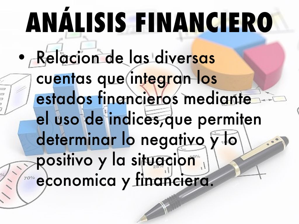 Relacion de las diversas cuentas que integran los estados financieros mediante el uso de indices,que permiten determinar lo negativo y lo positivo y la situacion economica y financiera.