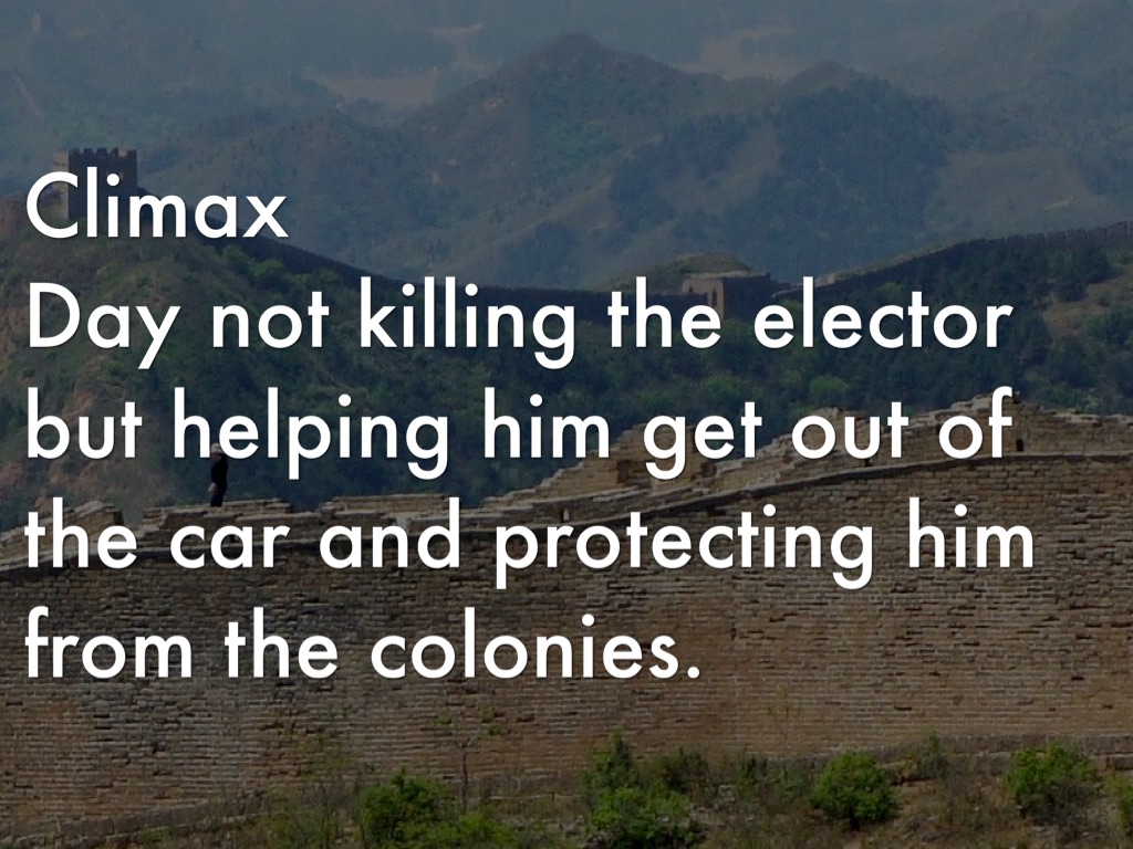 Day not killing the elector but helping him get out of the car and protecting him from the colonies.