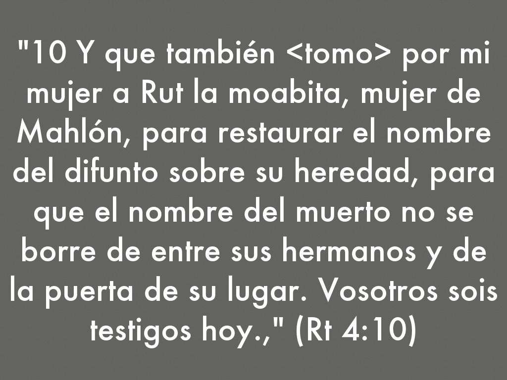 "10 Y que también por mi mujer a Rut la moabita, mujer de Mahlón, para restaurar el nombre del difunto sobre su heredad, para que el nombre del muerto no se borre de entre sus hermanos y de la puerta de su lugar. Vosotros sois testigos hoy.," (Rt 4:10)
