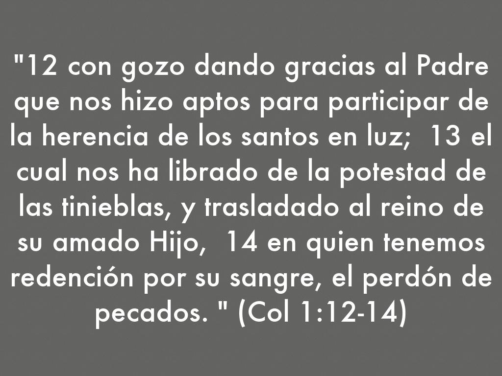 "12 con gozo dando gracias al Padre que nos hizo aptos para participar de la herencia de los santos en luz; 13 el cual nos ha librado de la potestad de las tinieblas, y trasladado al reino de su amado Hijo, 14 en quien tenemos redención por su sangre, el perdón de pecados. " (Col 1:12-14)