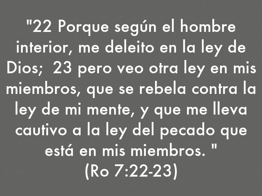 "22 Porque según el hombre interior, me deleito en la ley de Dios; 23 pero veo otra ley en mis miembros, que se rebela contra la ley de mi mente, y que me lleva cautivo a la ley del pecado que está en mis miembros. "