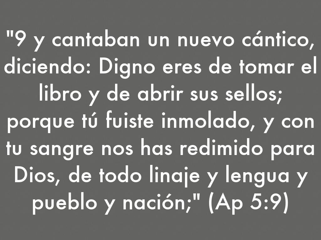 "9 y cantaban un nuevo cántico, diciendo: Digno eres de tomar el libro y de abrir sus sellos; porque tú fuiste inmolado, y con tu sangre nos has redimido para Dios, de todo linaje y lengua y pueblo y nación;" (Ap 5:9)