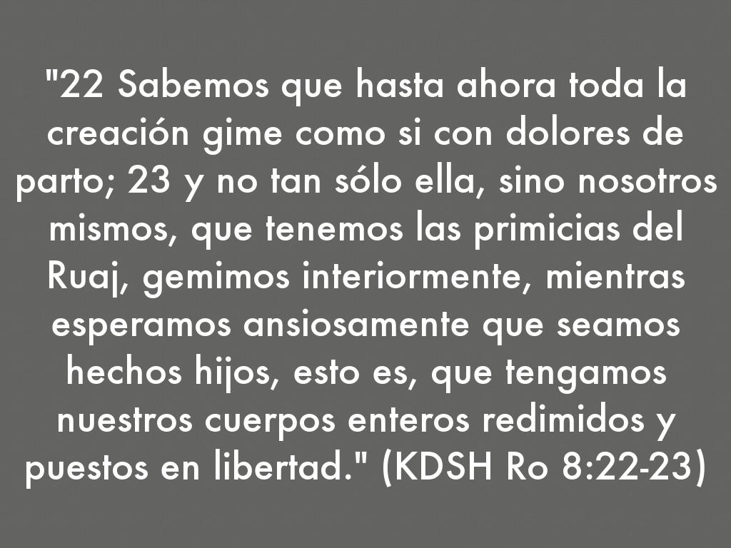 "22 Sabemos que hasta ahora toda la creación gime como si con dolores de parto; 23 y no tan sólo ella, sino nosotros mismos, que tenemos las primicias del Ruaj, gemimos interiormente, mientras esperamos ansiosamente que seamos hechos hijos, esto es, que tengamos nuestros cuerpos enteros redimidos y puestos en libertad." (KDSH Ro 8:22-23)