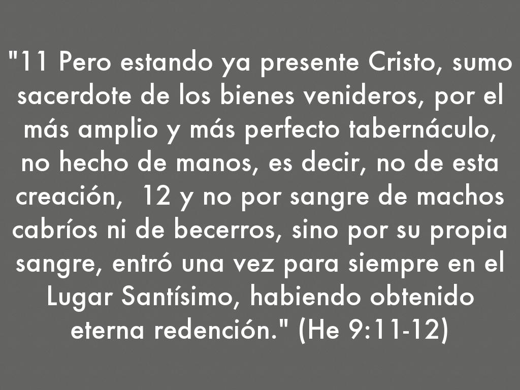 "11 Pero estando ya presente Cristo, sumo sacerdote de los bienes venideros, por el más amplio y más perfecto tabernáculo, no hecho de manos, es decir, no de esta creación, 12 y no por sangre de machos cabríos ni de becerros, sino por su propia sangre, entró una vez para siempre en el Lugar Santísimo, habiendo obtenido eterna redención." (He 9:11-12)