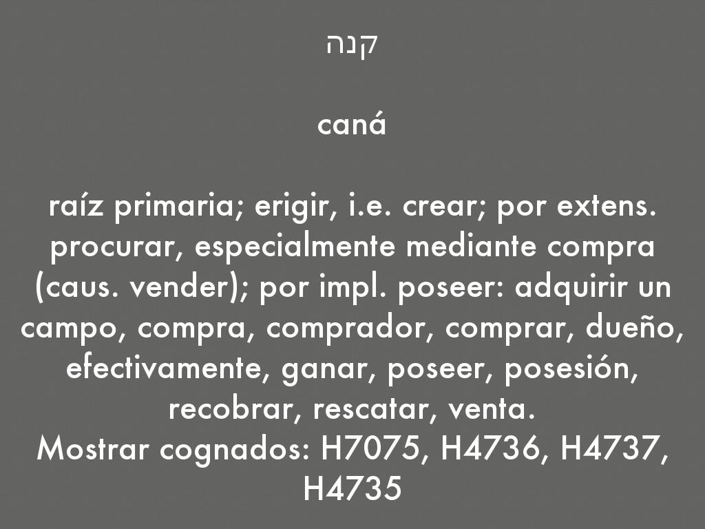 raíz primaria; erigir, i.e. crear; por extens. procurar, especialmente mediante compra (caus. vender); por impl. poseer: adquirir un campo, compra, comprador, comprar, dueño, efectivamente, ganar, poseer, posesión, recobrar, rescatar, venta.