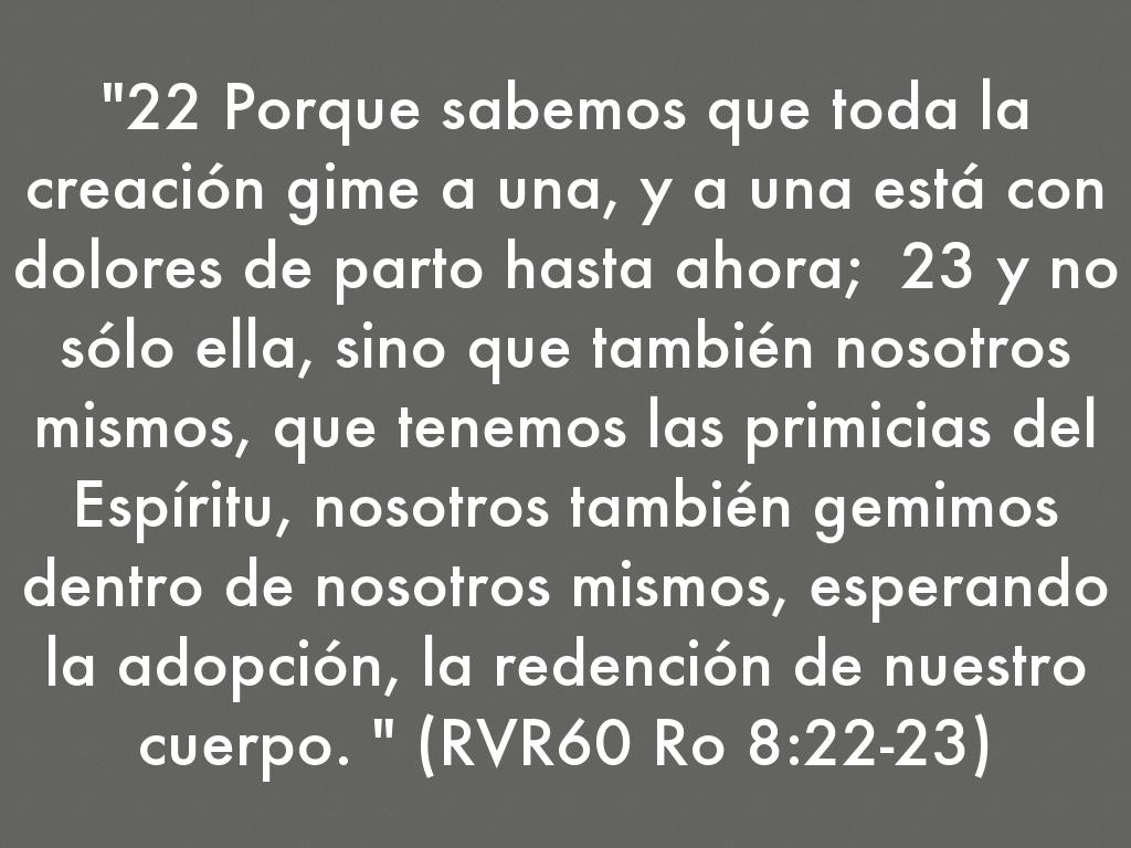 "22 Porque sabemos que toda la creación gime a una, y a una está con dolores de parto hasta ahora; 23 y no sólo ella, sino que también nosotros mismos, que tenemos las primicias del Espíritu, nosotros también gemimos dentro de nosotros mismos, esperando la adopción, la redención de nuestro cuerpo. " (RVR60 Ro 8:22-23)