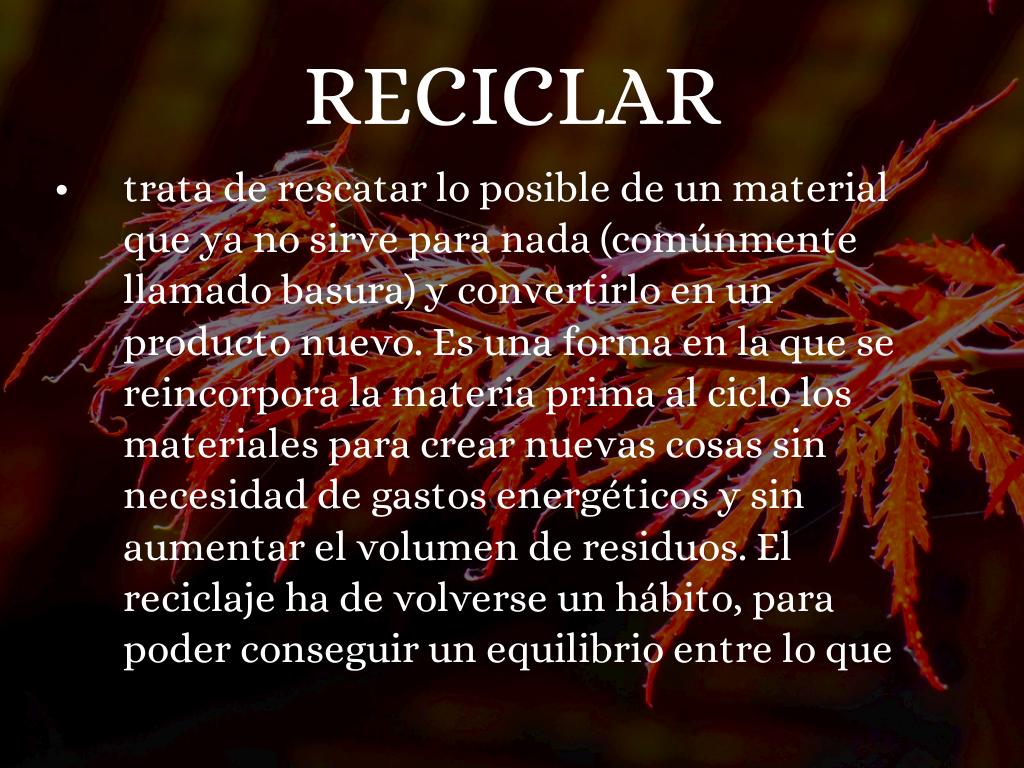 trata de rescatar lo posible de un material que ya no sirve para nada (comúnmente llamado basura) y convertirlo en un producto nuevo. Es una forma en la que se reincorpora la materia prima al ciclo los materiales para crear nuevas cosas sin necesidad de gastos energéticos y sin aumentar el volumen de residuos. El reciclaje ha de volverse un hábito, para poder conseguir un equilibrio entre lo que se produce, lo que se consume y lo que se desecha, intentando siempre generar la menor cantidad posible de basura. Reciclar vidrio, materia orgánica, llantas o plástico, son algunos ejemplos.