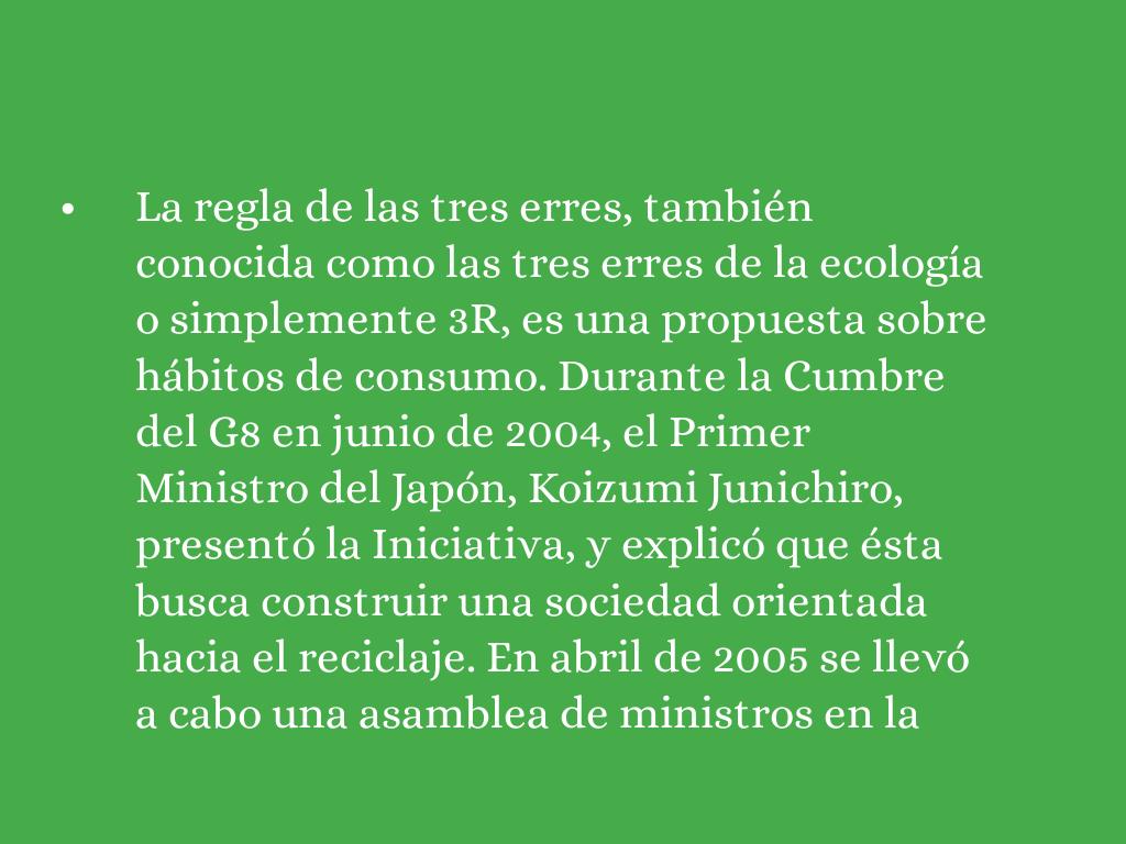 La regla de las tres erres, también conocida como las tres erres de la ecología o simplemente 3R, es una propuesta sobre hábitos de consumo. Durante la Cumbre del G8 en junio de 2004, el Primer Ministro del Japón, Koizumi Junichiro, presentó la Iniciativa, y explicó que ésta busca construir una sociedad orientada hacia el reciclaje. En abril de 2005 se llevó a cabo una asamblea de ministros en la que los representantes de más de 20 países discutieron la manera en que se podrían implementar de manera internacional acciones relacionadas a las tres erres.