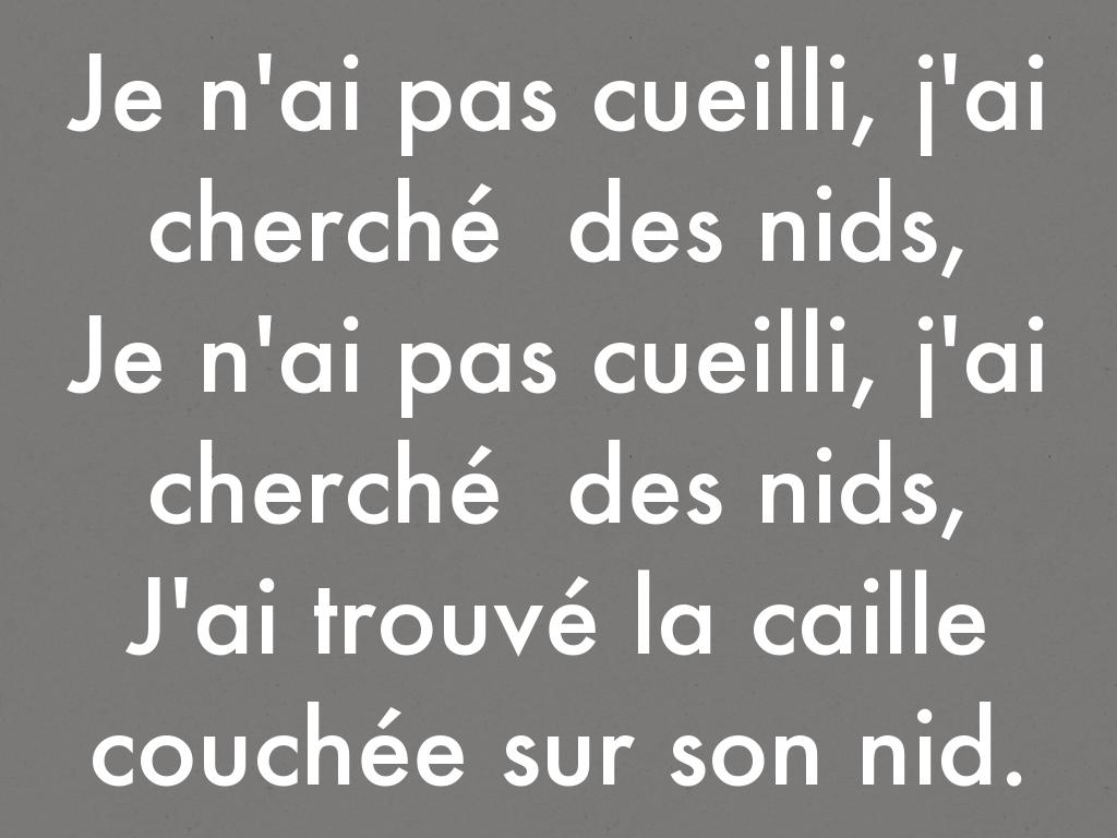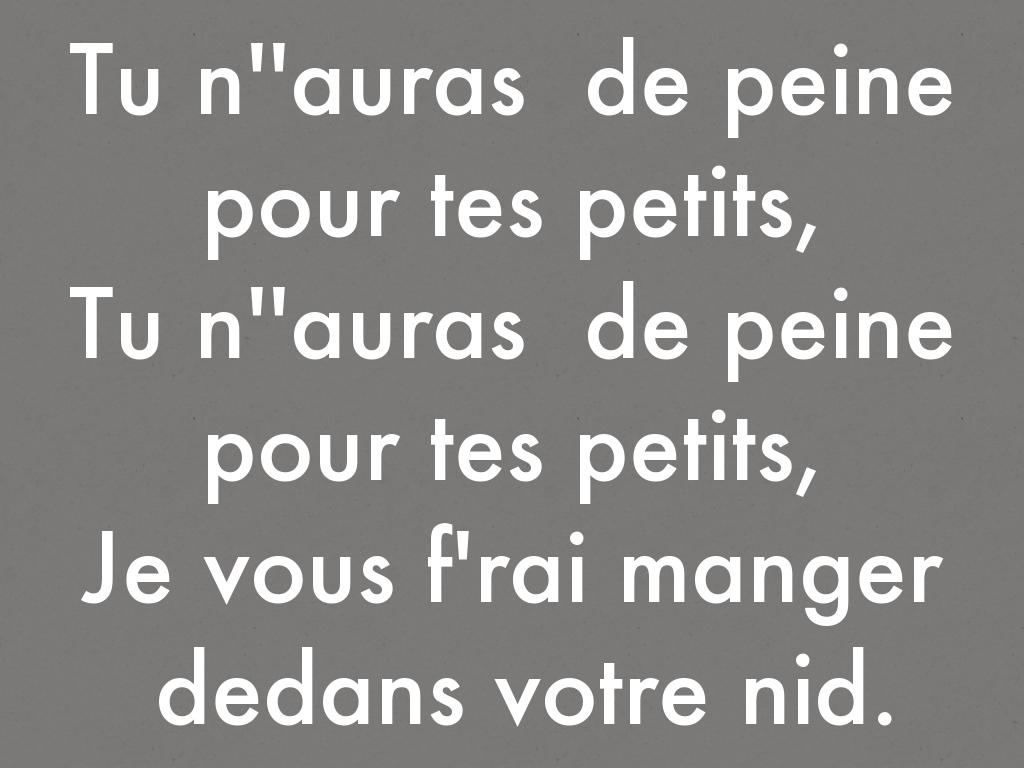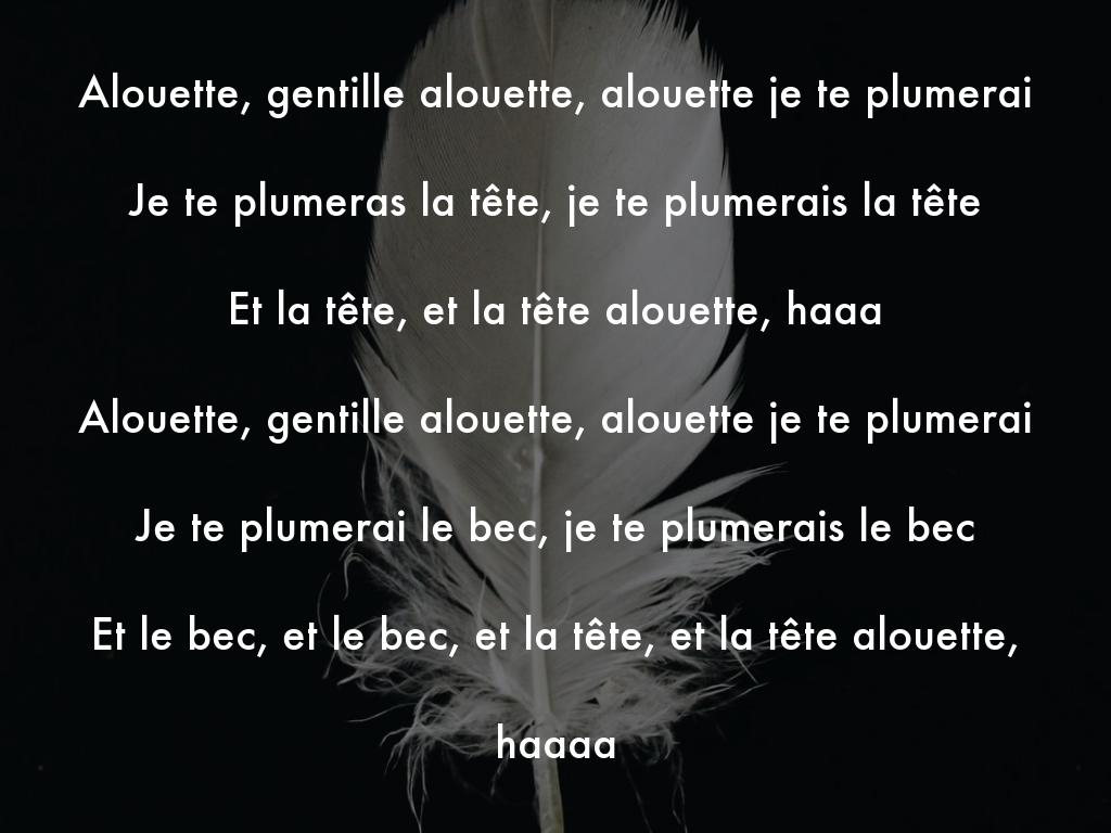 Refrain Au chant de l'alouette je veille et je dors, J'écoute l'alouette et puis je m'endors, ,Au chant de l'alouette je veille et je dors, J'écoute l'alouette et puis je m'endors.