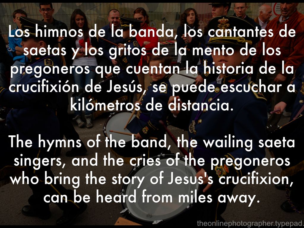 The hymns of the band, the wailing saeta singers, and the cries of the pregoneros who bring the story of Jesus's crucifixion, can be heard from miles away.