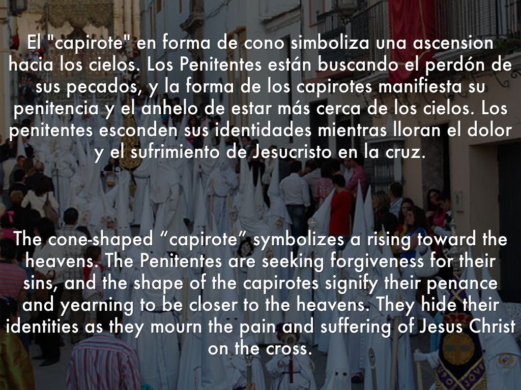 El "capirote" en forma de cono simboliza una ascension hacia los cielos. Los Penitentes están buscando el perdón de sus pecados, y la forma de los capirotes manifiesta su penitencia y el anhelo de estar más cerca de los cielos. Los penitentes esconden sus identidades mientras lloran el dolor y el sufrimiento de Jesucristo en la cruz.