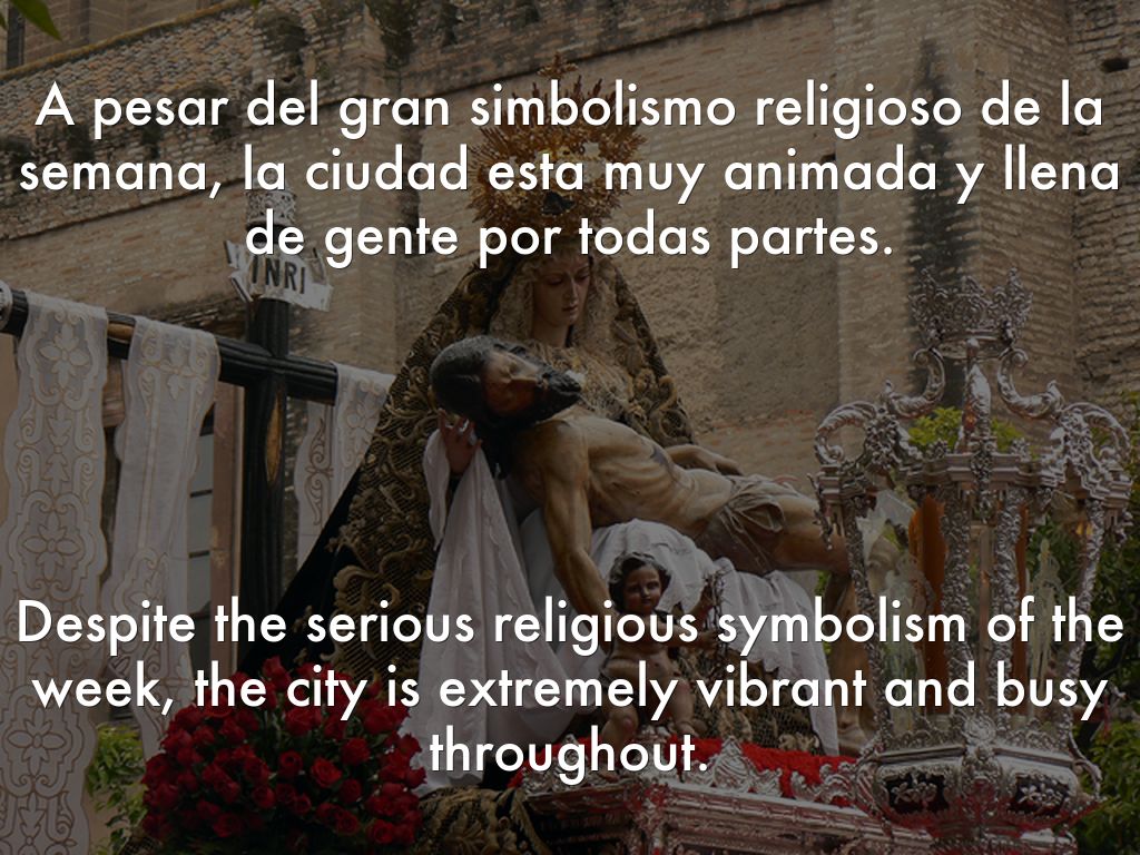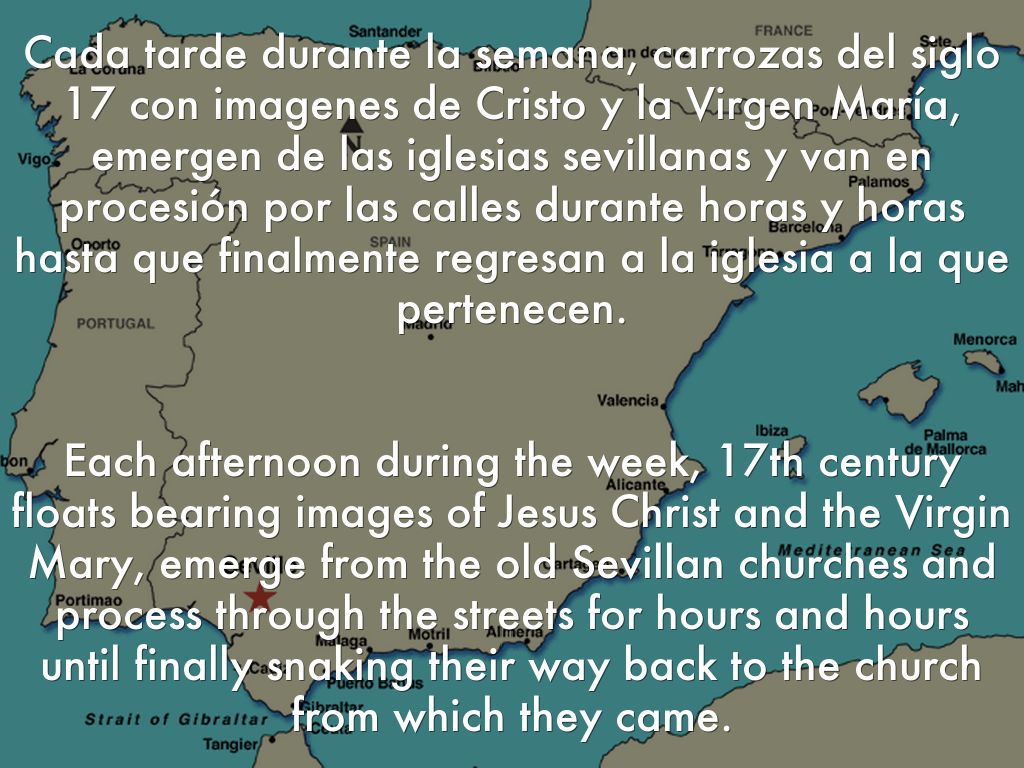 Cada tarde durante la semana, carrozas del siglo 17 con imagenes de Cristo y la Virgen María, emergen de las iglesias sevillanas y van en procesión por las calles durante horas y horas, hasta que finalmente regresan a la iglesia a la que pertenecen.