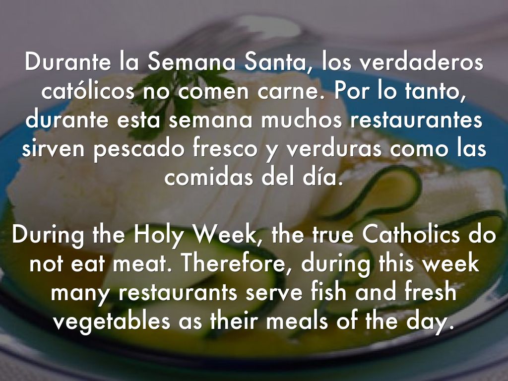 Durante la Semana Santa, los verdaderos católicos no comen carne. Por lo tanto, durante esta semana muchos restaurantes sirven pescado fresco y verduras como las comidas del día.