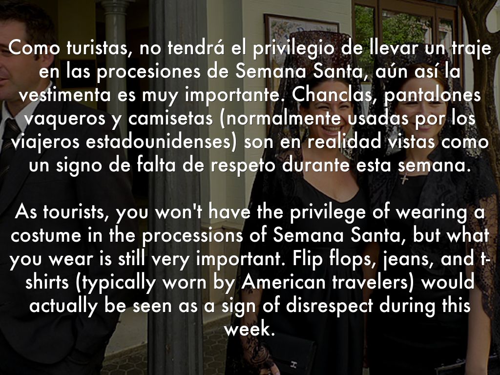 Como turista, no tendrá el privilegio de llevar un traje en las procesiones de Semana Santa, aún así la vestimenta es muy importante. Chanclas, pantalones vaqueros y camisetas (normalmente usadas por los viajeros estadounidenses) son en realidad vistas como un signo de falta de respeto durante esta semana.