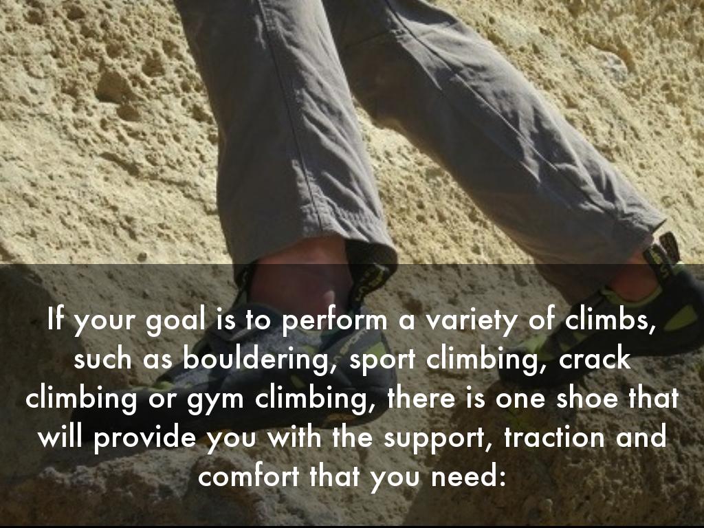 If your goal is to perform a variety of climbs, such as bouldering, sport climbing, crack climbing or gym climbing, there is one shoe that will provide you with the support, traction and comfort that you need: