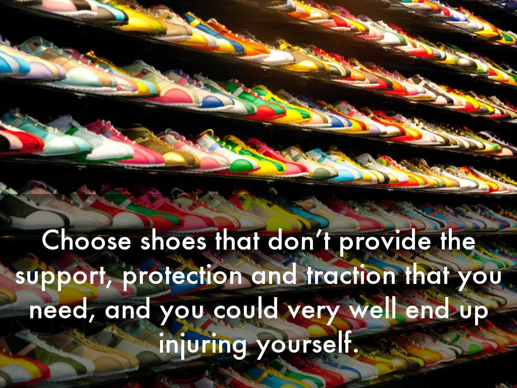 Choose shoes that don’t provide the support, protection and traction that you need, and you could very well end up injuring yourself.