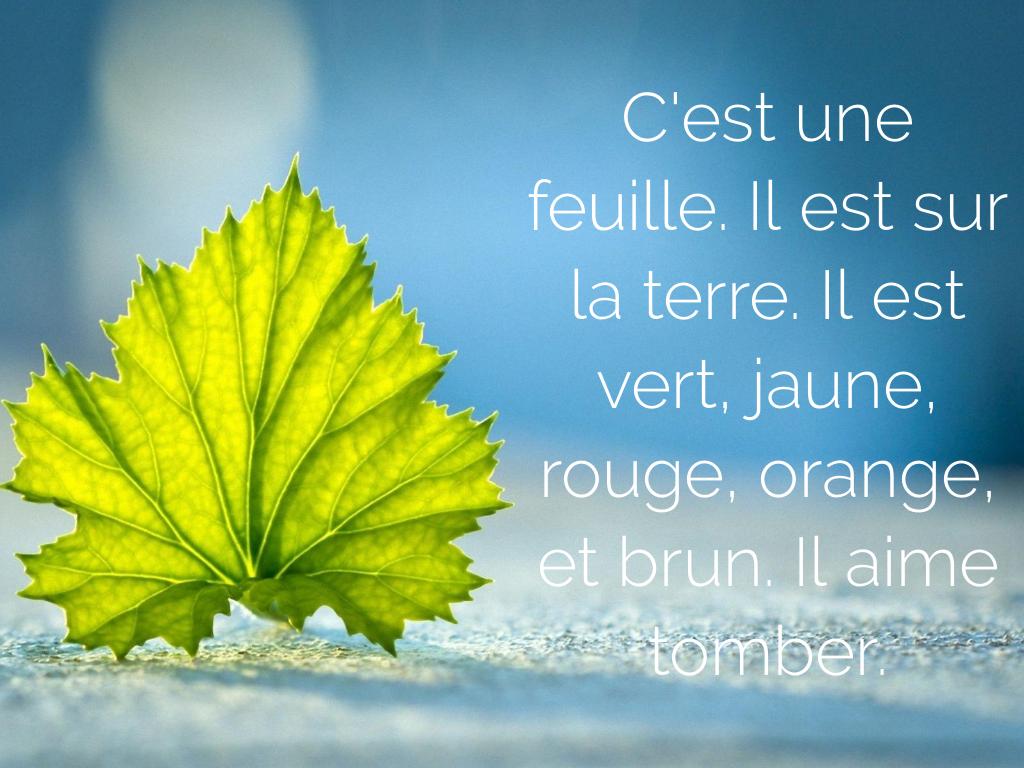 C'est une feuille. Il est sur la terre. Il est vert, jaune, rouge, orange, et brun. Il aime tomber.