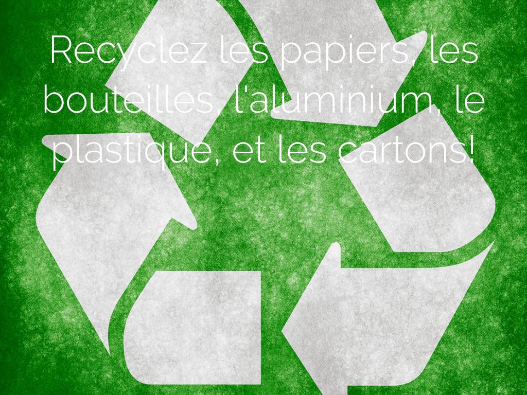 Recyclez les papiers, les bouteilles, l'aluminium, le plastique, et les cartons!