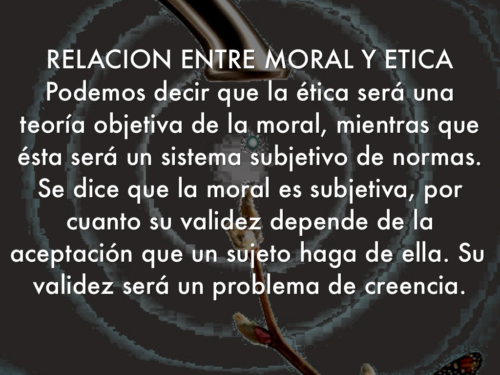 Podemos decir que la ética será una teoría objetiva de la moral, mientras que ésta será un sistema subjetivo de normas. Se dice que la moral es subjetiva, por cuanto su validez depende de la aceptación que un sujeto haga de ella. Su validez será un problema de creencia.