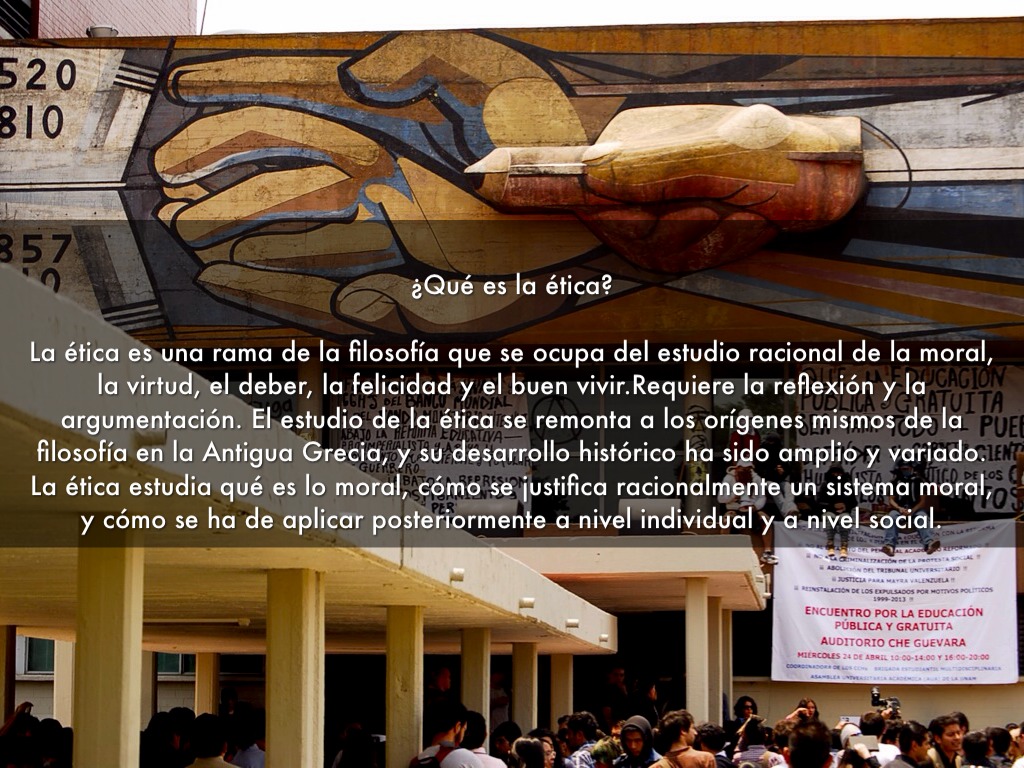 La ética es una rama de la filosofía que se ocupa del estudio racional de la moral, la virtud, el deber, la felicidad y el buen vivir.Requiere la reflexión y la argumentación. El estudio de la ética se remonta a los orígenes mismos de la filosofía en la Antigua Grecia, y su desarrollo histórico ha sido amplio y variado.