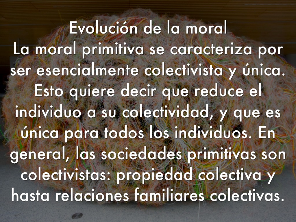 La moral primitiva se caracteriza por ser esencialmente colectivista y única. Esto quiere decir que reduce el individuo a su colectividad, y que es única para todos los individuos. En general, las sociedades primitivas son colectivistas: propiedad colectiva y hasta relaciones familiares colectivas.