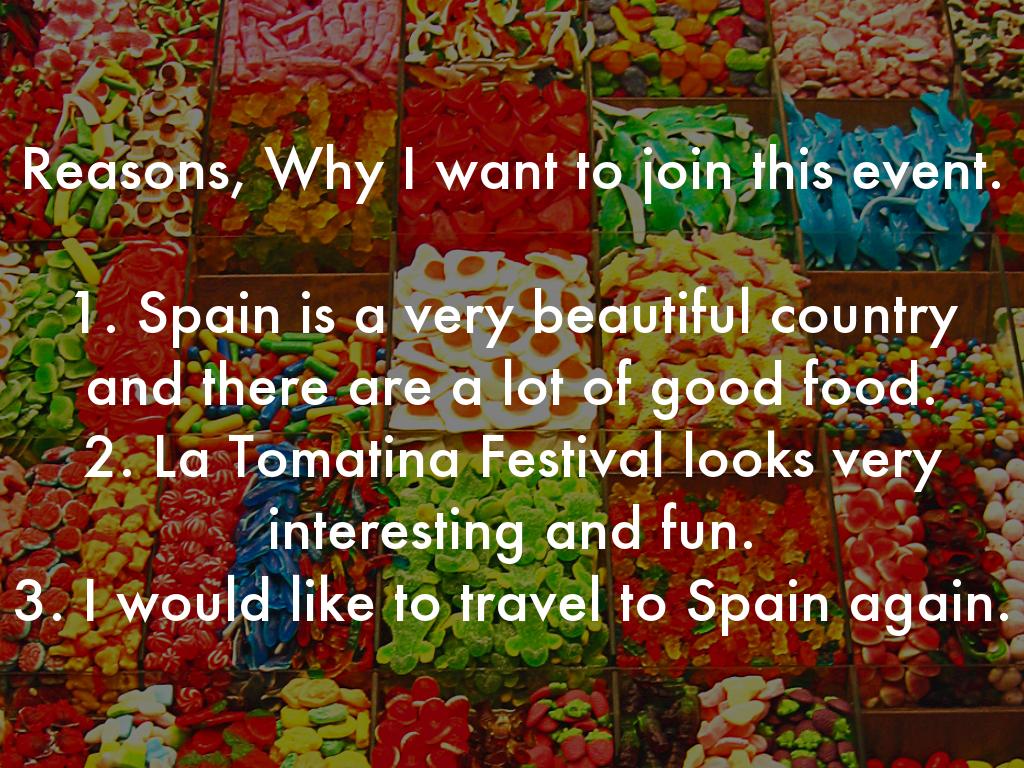 1. Spain is a very beautiful country and there are a lot of good food. 2. La Tomatina Festival looks very interesting and fun. 3. I would like to travel to Spain again.