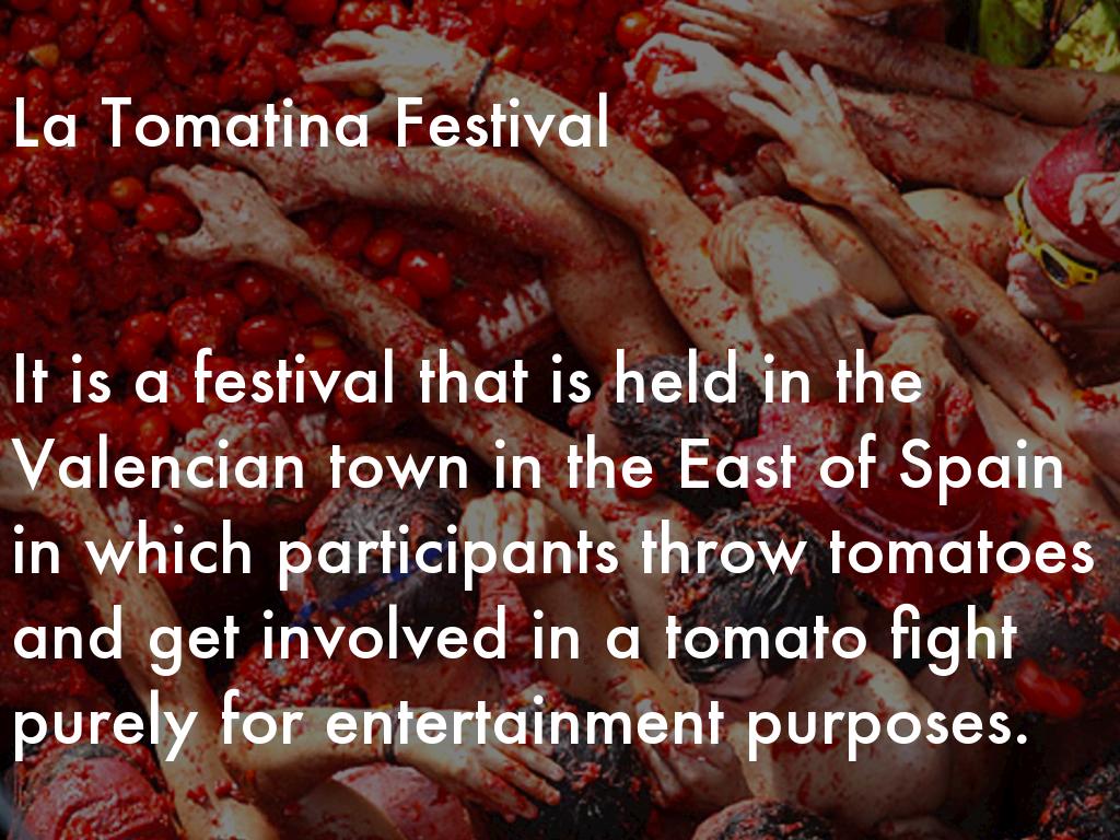 It is a festival that is held in the Valencian town in the East of Spain in which participants throw tomatoes and get involved in a tomato fight purely for entertainment purposes.