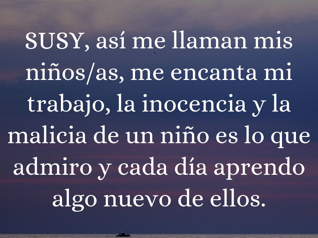SUSY, así me llaman mis niños/as, me encanta mi trabajo, la inocencia y la malicia de un niño es lo que admiro y cada día aprendo algo nuevo de ellos.
