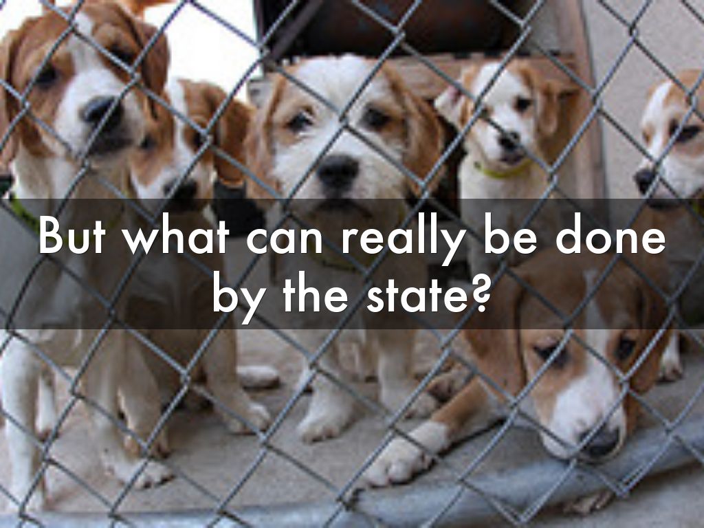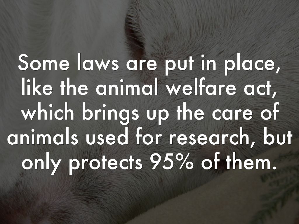 Some laws are put in place, like the animal welfare act, which brings up the care of animals used for research, but only protects 95% of them.