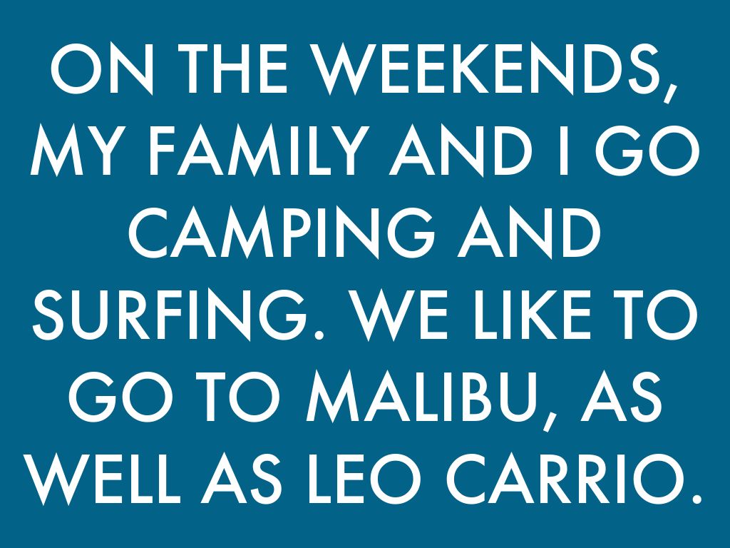 ON THE WEEKENDS, MY FAMILY AND I GO CAMPING AND SURFING. WE LIKE TO GO TO MALIBU, AS WELL AS LEO CARRIO.