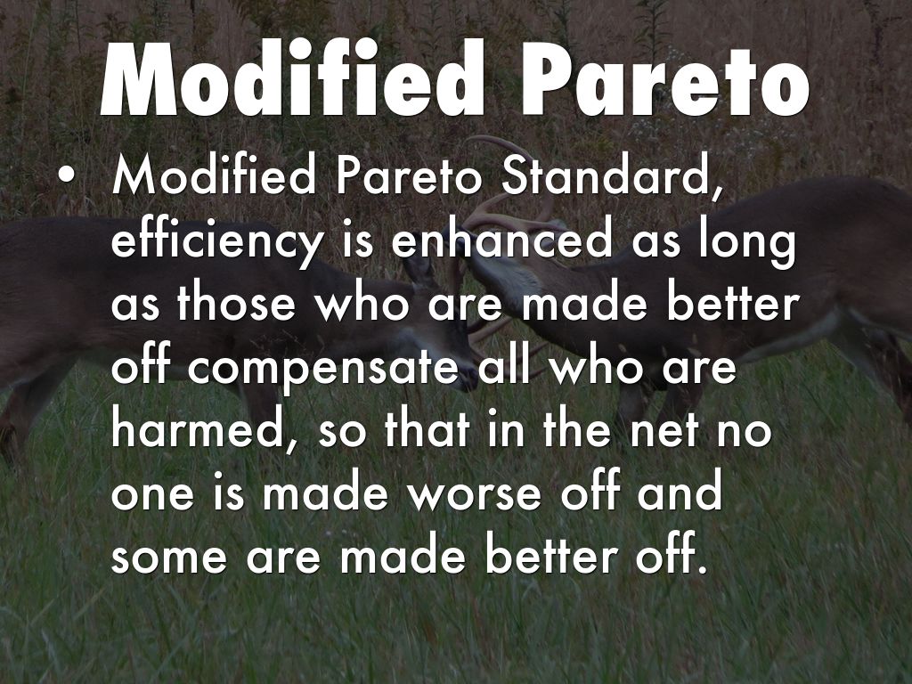 Modified Pareto Standard, efficiency is enhanced as long as those who are made better off compensate all who are harmed, so that in the net no one is made worse off and some are made better off.