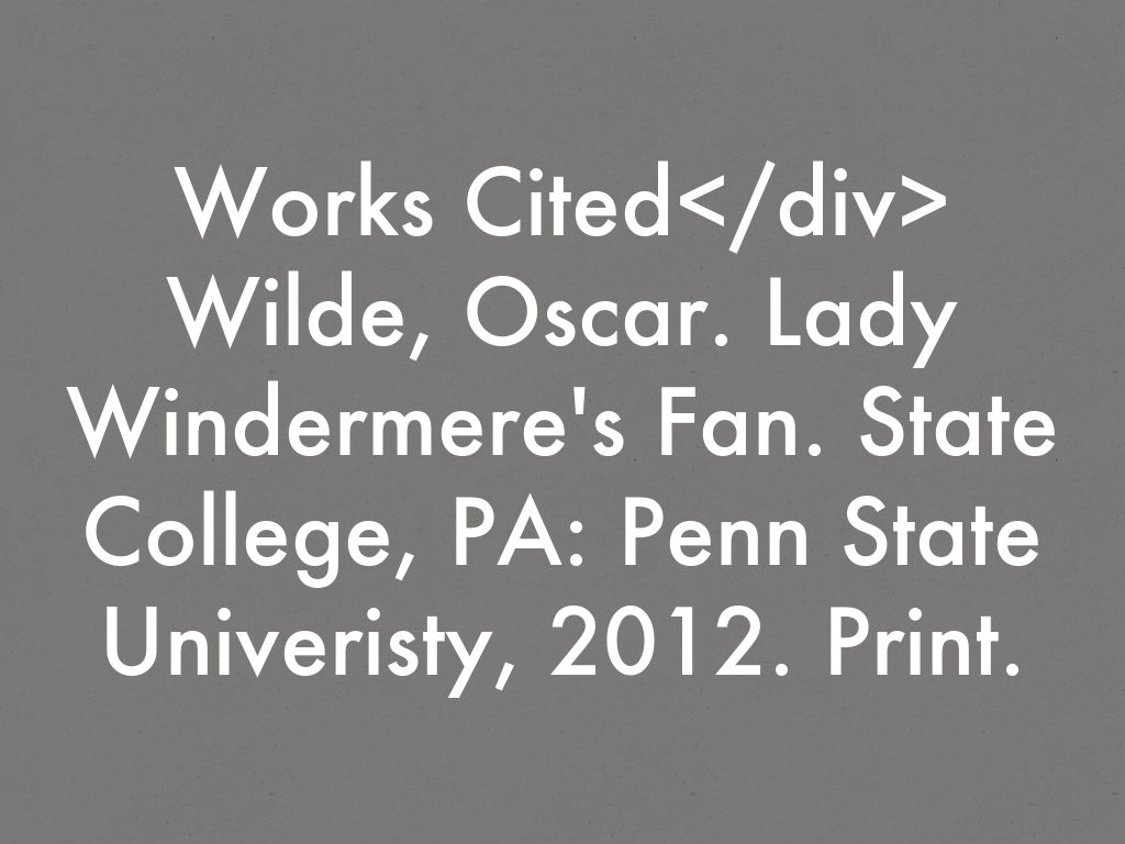 Wilde, Oscar. Lady Windermere's Fan. State College, PA: Penn State Univeristy, 2012. Print.