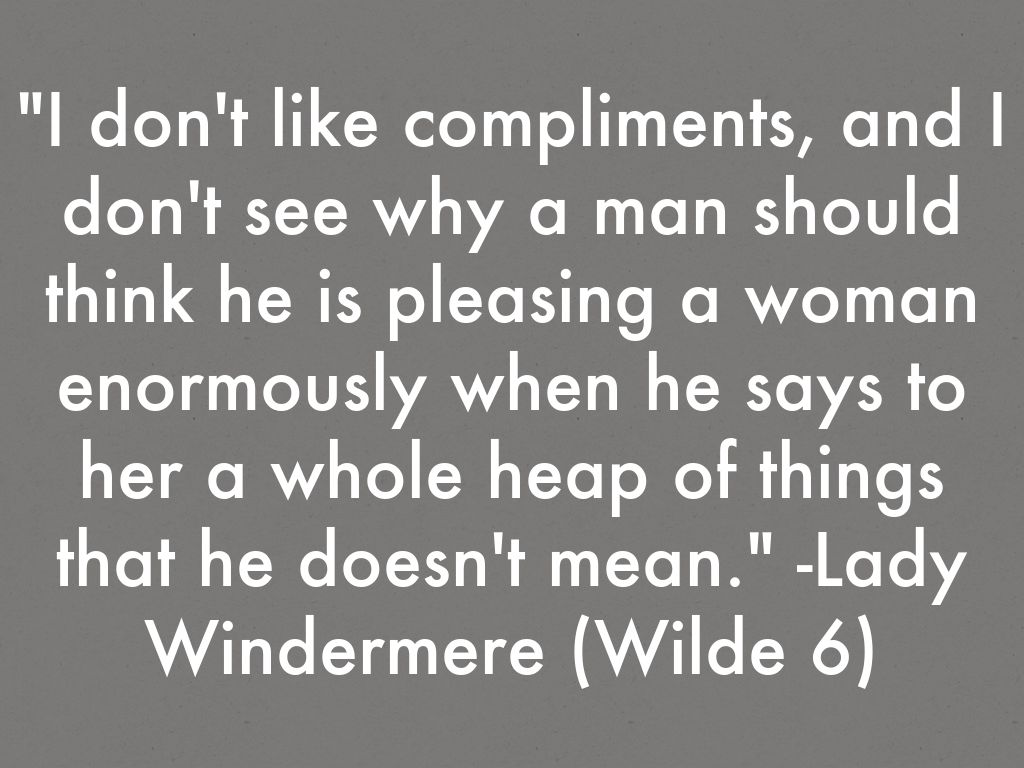 "I don't like compliments, and I don't see why a man should think he is pleasing a woman enormously when he says to her a whole heap of things that he doesn't mean." -Lady Windermere (Wilde 6)