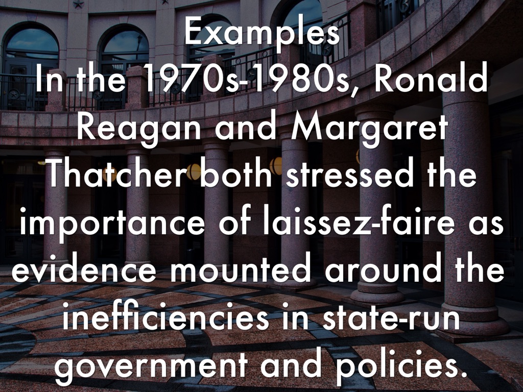 Examples In the 1970s-1980s, Ronald Reagan and Margaret Thatcher both stressed the importance of laissez-faire as evidence mounted around the inefficiencies in state-run government and policies.