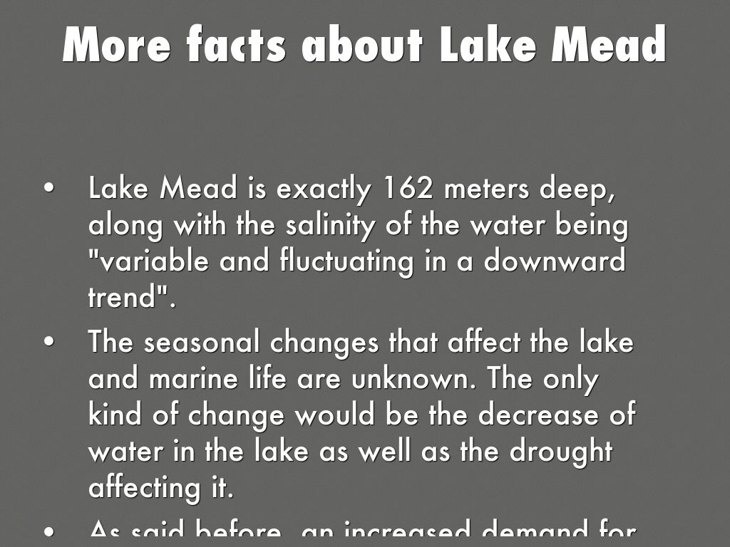 Lake Mead is exactly 162 meters deep, along with the salinity of the water being "variable and fluctuating in a downward trend".