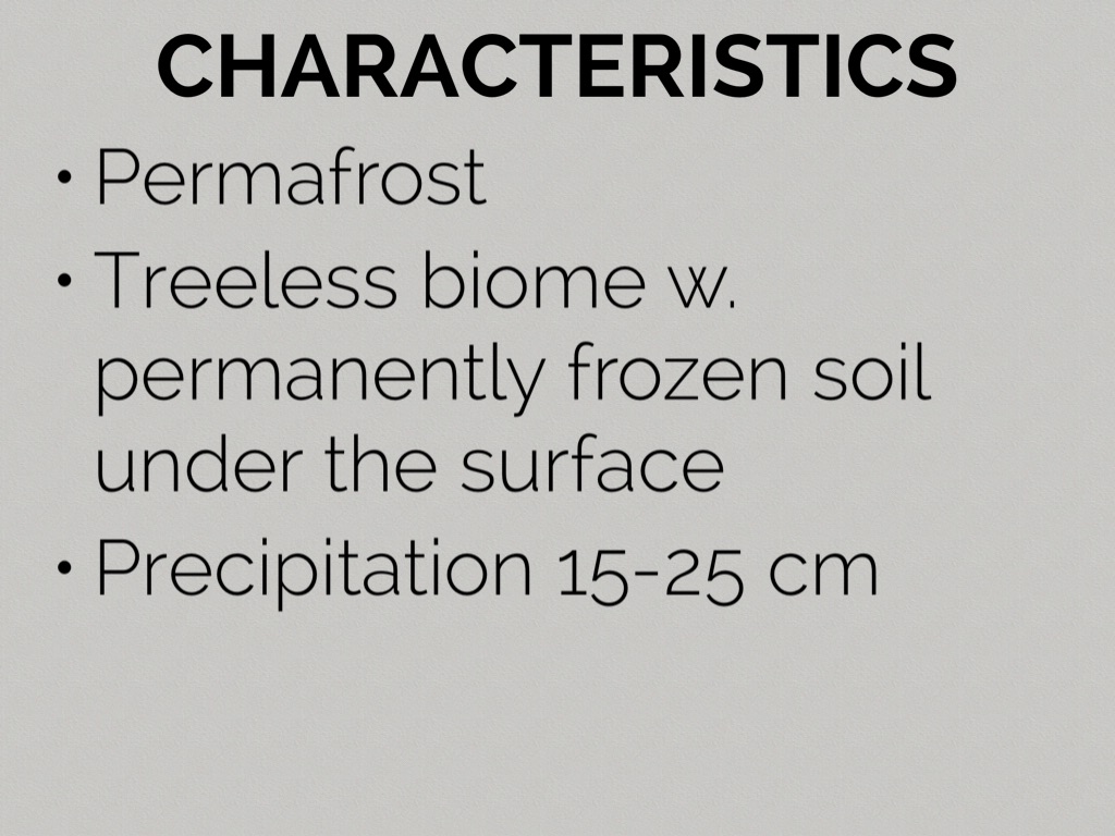 - Treeless biome w. permanently frozen soil under the surface